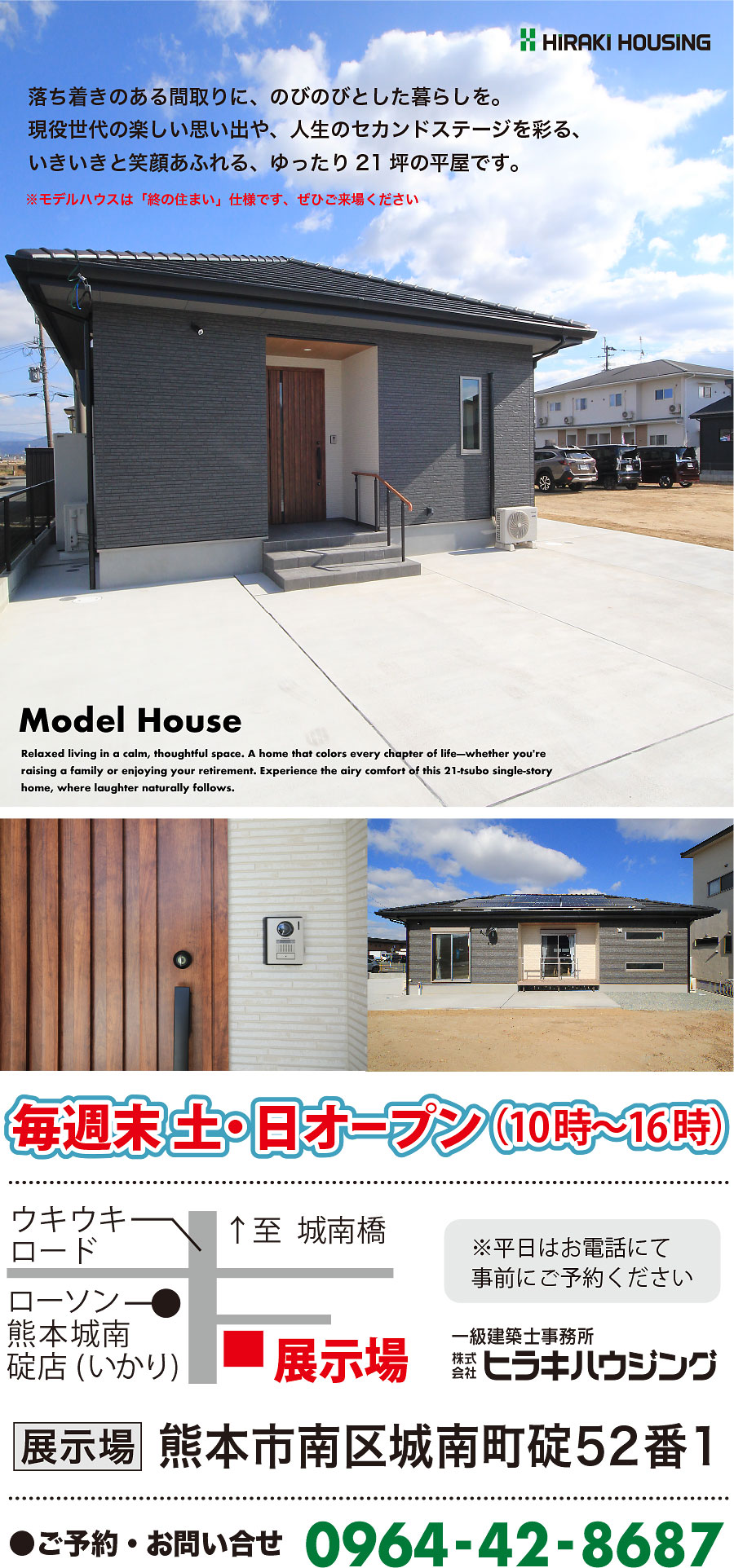 熊本の住宅メーカー「ヒラキハウジング」です。熊本で100年の歴史を誇り、自然素材をつかった注文住宅から増改築やリフォームなどを企画しています。